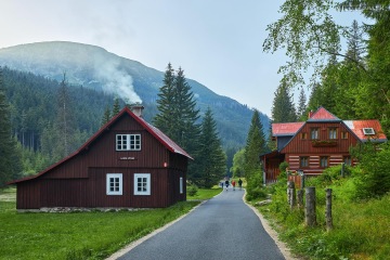 Asfaltová cesta zde prudce stoupá, na konci nás však čeká překrásné horské údolí s několika původními chalupami, které jsou zapsány jako chráněný soubor původní horské architektury. Dále po žluté turistické značce do Obřího dolu. Vyjdete před Boudou v Obřím dole.