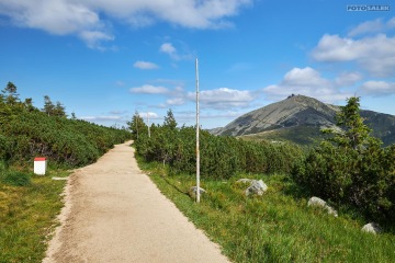Z parkoviště hotelu Horizont se vydáte doprava do kopce po asfaltové silnici. Po cestě budete míjet Richtrovy boudy a po táhlém stoupání dojdete až na křižovatku k chatě Výrovka. Zde se vydáte doprava po červené turistické značce na Studniční horu. Zde se určitě zastavte u Památníku obětem hor a vychutnejte si nádherné výhledy na Luční boudu a Sněžku. Pokračujete dále k Luční Boudě a odtud na turistickou modrou značku, která Vás dovede po povalovém chodníku přes Úpské rašeliniště až ke Slezskému domu v Obřím sedle pod Sněžkou. Odtud pokračujte po červené turistické značce až na vrchol Sněžky.