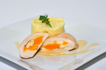 Confit of Barbarie duck leg in fresh lard with pumpkin cabbage and mushroom bread dumplings
